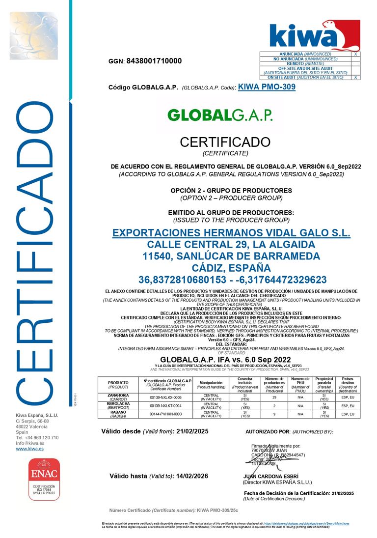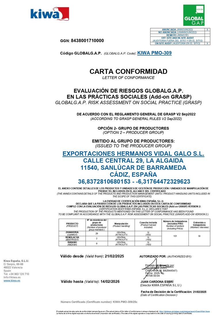 Exportartaciones Hermanos Vidal Galo SL, sigue estrictamente una política de calidad y mejora continua en los servicios que proporciona, al igual que un sistema de gestión social. Es por ello que disponemos de los certificados de máximo prestigio: