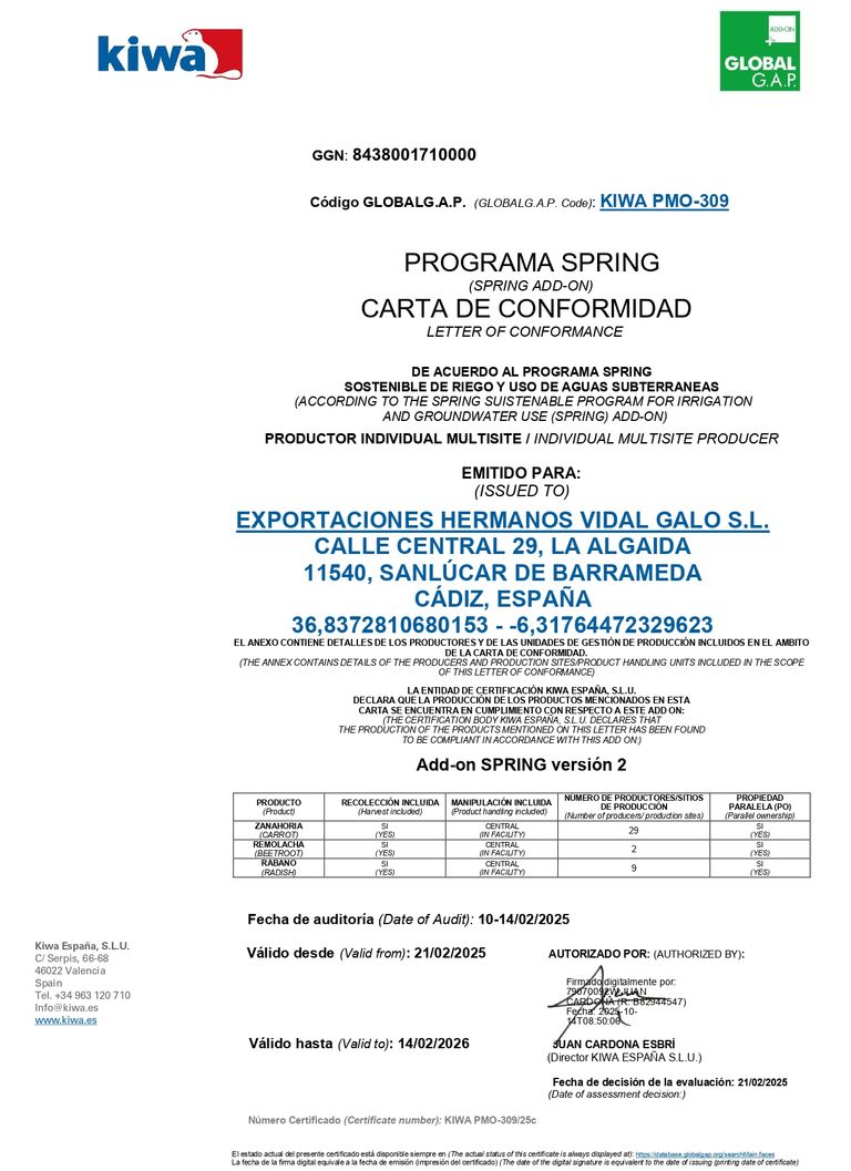 Cumple el protocolo de IFS Food en su proceso de producción, realizando el máximo seguimiento a sus productos, con sistemas de trazabilidad exhaustivos y análisis químico de cada cosecha.